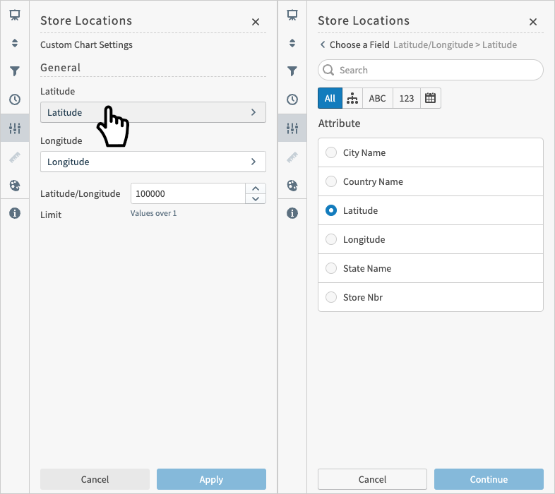 ungrouped variables are represented by a series of buttons to allow users to select a set number of fields matched up with labels. Below the field buttons is a number input to choose a limit to the number of records that should be returned. By default, the labels provided are used to attempt to select the correct fields. If no fields match the labels, the first n fields are selected.