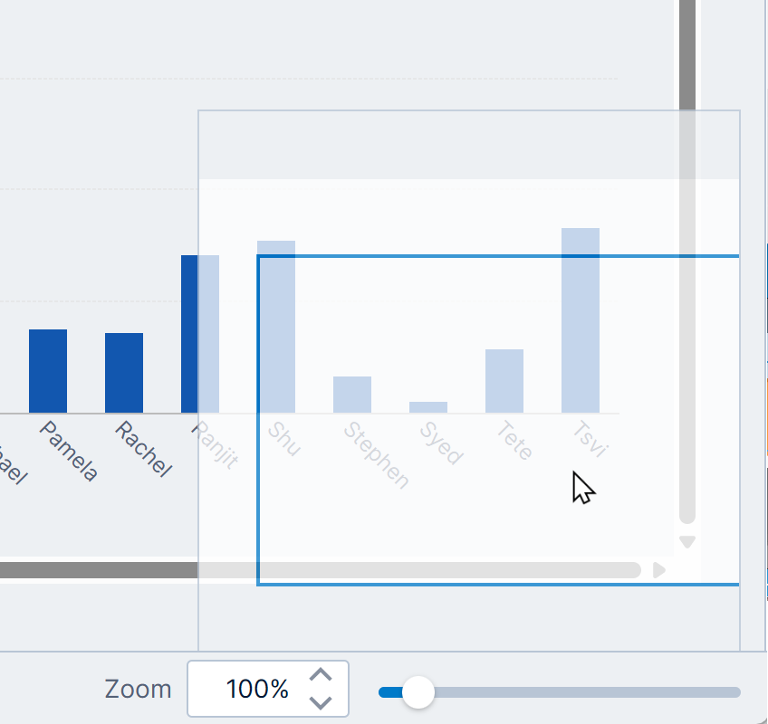 You can use the zoom slider and the view panel in the status bar to zoom in, zoom out, or pan the dashboard. Scrollbars will appear as needed when zooming in.