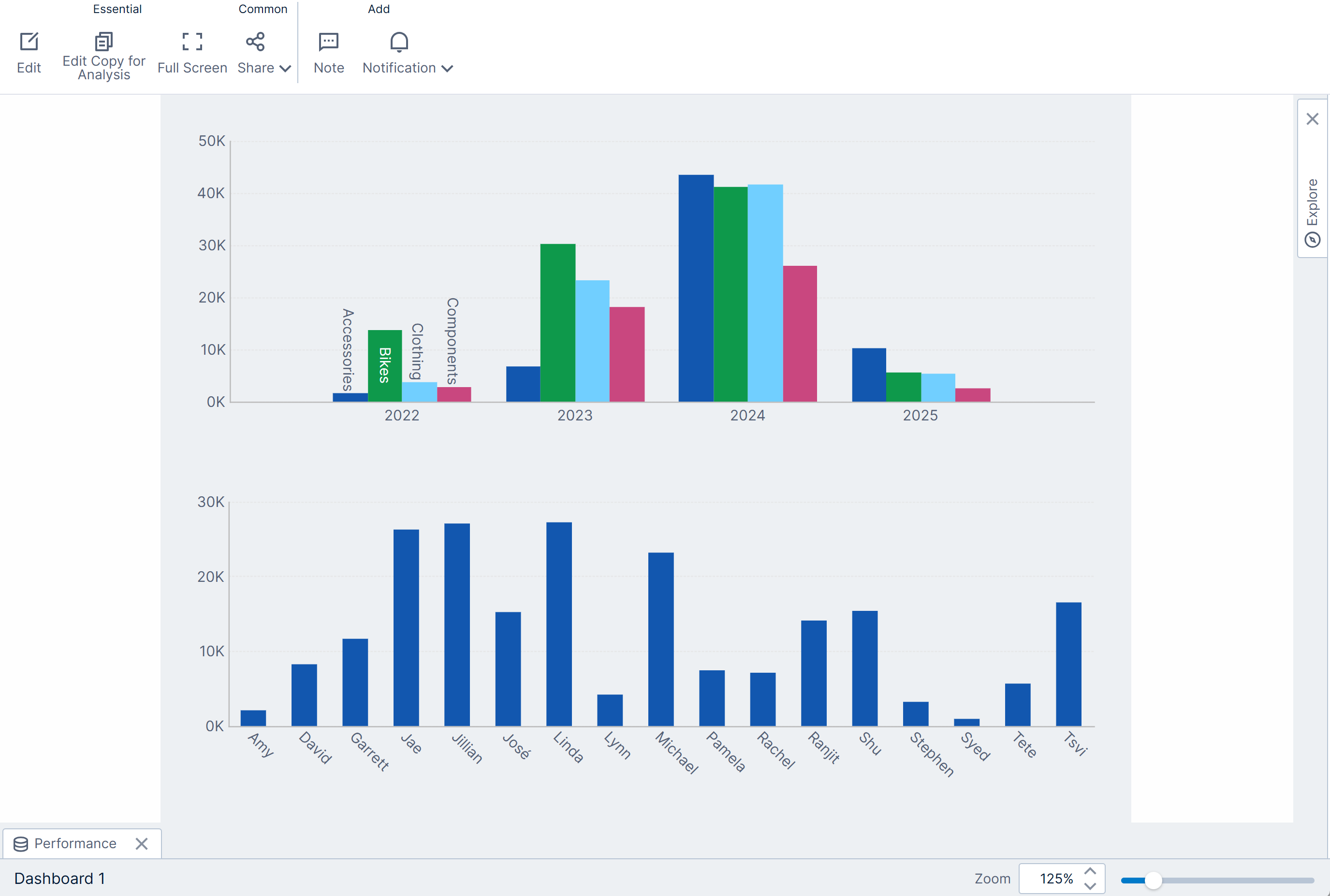 With the dashboard set to Resize in this example, observe that the dashboard can be manipulated into different aspect ratios, or made smaller, but visualizations such as charts are able to adjust their layouts intelligently to match.