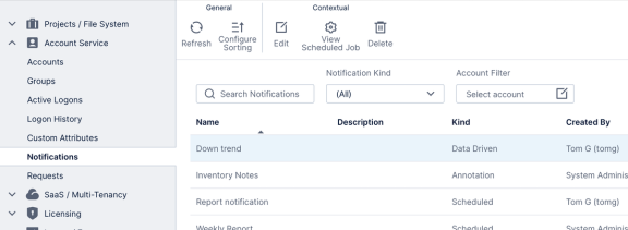 In the administration area, expand Account Service on the left and select Notifications. You can search, sort, and filter the list of notifications by tenant (if applicable), account, or the kind of notification.