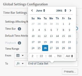You can set time bar defaults for data sources used in your Symphony environment. These defaults are specified in data source configurations and are applied to visuals that are created using the data sources. Specifically, you can specify: