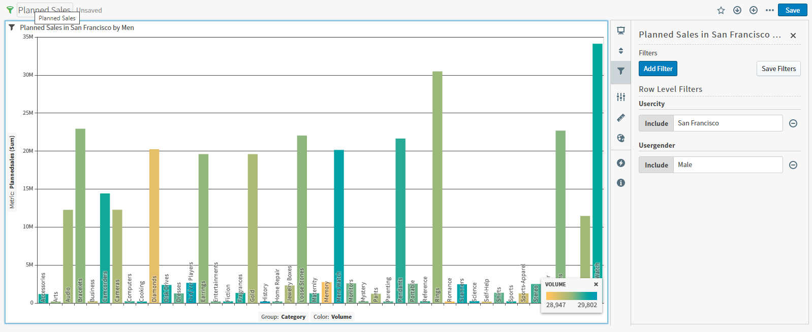 Suppose you want to learn what the planned sales are for different product categories for male customers in San Francisco. You might apply a series of row-level filters using the following steps.