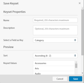 In the Select a Field as Key box, enter the field that should be used as the key for the keyset. A list of keyset values for the field you selected appears on the Save Keyset dialog. These values can include an empty value.