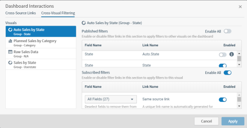 For each visual in a dashboard, you can select cross-source and same-source links to publish. When a visual publishes a link, that visual can apply cross-visual filters using the link field to other dashboard visuals that have subscribed to the link. Cross-visual filters can only be applied if the associated link is published. In addition, they can only be applied using the Filter option on the context menu.