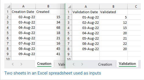 As an example, the following two sheets from Excel have been dragged onto the data cube canvas. They each contain numeric counts tracked by dates or timestamps, where it is common and expected for them to not match: