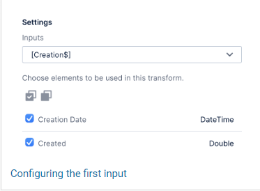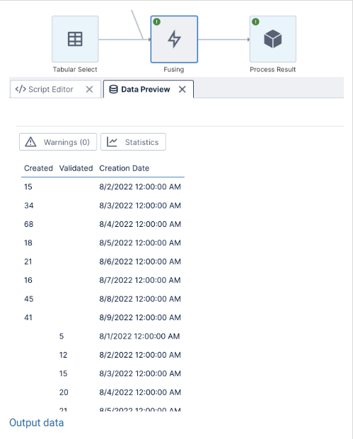 In the example above, the rows from the two inputs have been appended, the two numeric columns have been appended, and the two date columns have been combined. We could re-open the configuration dialog, click Output elements, and edit the date column's name to simply Date.