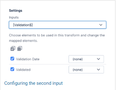 The drop-downs next to each input element allow you to choose whether they should be mapped with any of the elements from the first input, which will combine them into a single column in the output. Some of these may have been set for you automatically based on matching names. Any element that you want to remain a separate column can be set to (none).