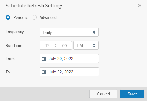 Note: If you disable Schedule Refresh Settings, any schedule you had set up previously is deleted.