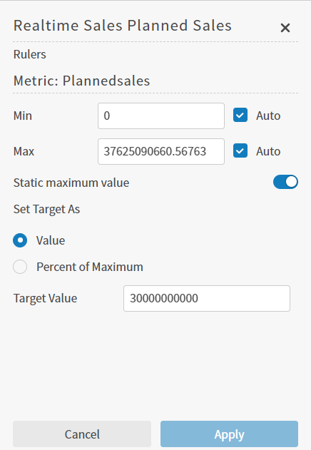 If the Static maximum value switch is on, specify the maximum value for the gauge. Select the Auto checkbox to have Symphony automatically determine the maximum value from the data for the bullet gauge metric.