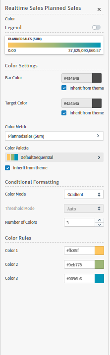 Color rules allow you to change the colors for each color used for the visual. In addition, if you specified a Manual threshold mode, you can select the thresholds used for color settings in the visual.