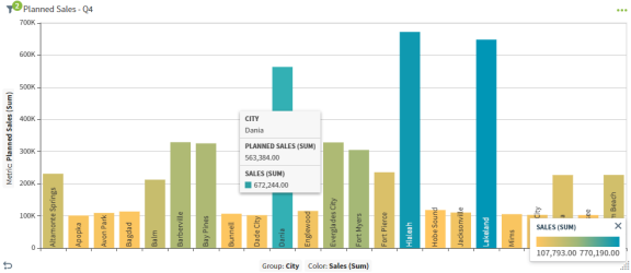 For example, if you wanted to see the real time sales for every city in Florida, select Florida in the bar chart to bring up the context menu, select Drill Down, and then select the City attribute from the resulting menu. The result set in the bar chart might look like this: